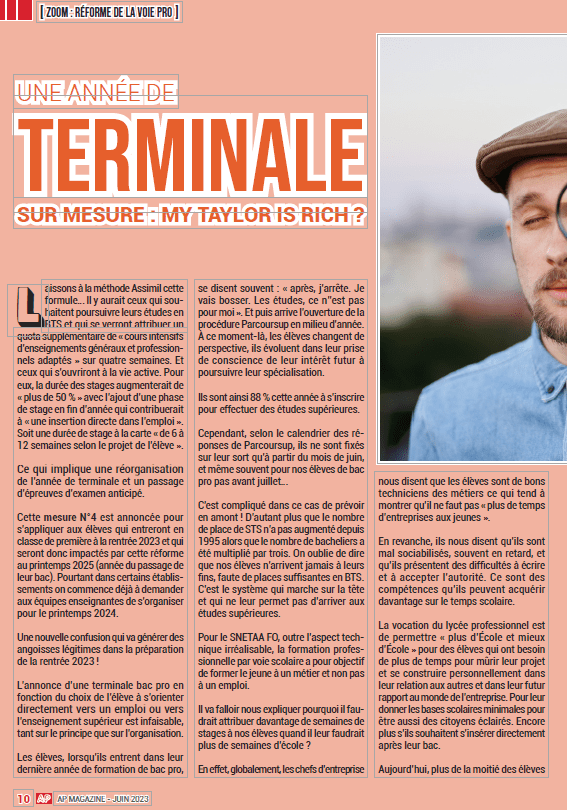Concernant l’enseignement professionnel, après 9 mois à lutter contre les attaques de la ministre déléguée qui n’a eu de cesse de stigmatiser les lycées professionnels et les PLP en leur reprochant les taux de décrochage scolaire, les difficultés d’insertion dans l’emploi (quand, les élèves d’aujourd’hui, plus jeunes que ceux de 1985, veulent poursuivre leurs études), quand elle imagine le lycée professionnel éloigné des entreprises alors que nos élèves sont pendant 22 semaines en PFMP, le Président de la République vient d’annoncer son projet de réforme le 04 mai 2023.