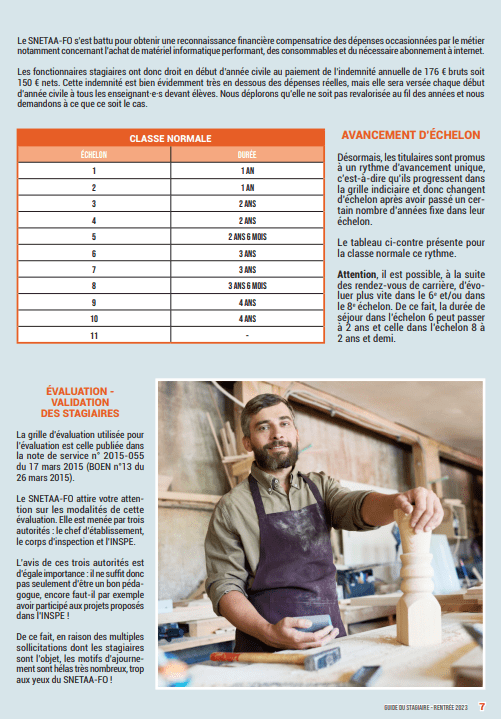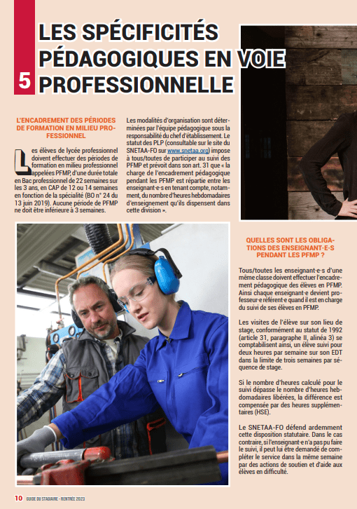 Aussi, le SNETAA-FO défend le statut des PLP et CPE, de meilleures conditions de travail pour les personnels et pour les jeunes qu’ils accueillent. C’est en ce sens qu’il est intervenu auprès du ministre pour préserver les moyens d’enseignement en bac pro et CAP et qu’il se bat au quotidien, seul contre tous ses concurrents, pour encore obtenir des garanties sur les contenus d’enseignement, sur le maintien des diplômes nationaux. Avec sa fédération, le SNETAA-FO a revendiqué et obtenu l’augmentation de l’indemnité annuelle spéciale CPE, amenant celle-ci à compenser l’absence de prime pour équipement informatique.
