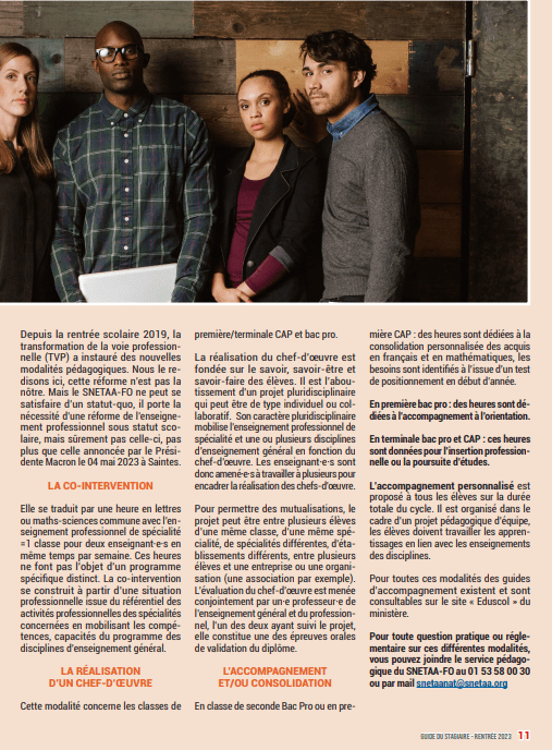 Force de contestation, le SNETAA-FO sait aussi être une force de proposition et mettre son potentiel militant au service de la défense de formation professionnelle initiale publique et laïque à laquelle il est attaché. Ainsi, il souhaite voir se développer les CAP de 1 à 3 ans, les bac pro et les BTS en lycée professionnel.