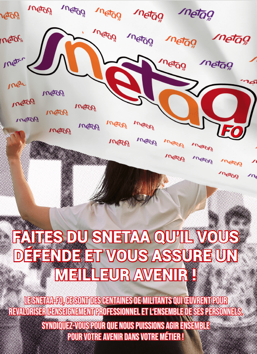 Depuis sa création en 1948, le SNETAA-FO n’a cessé de négocier et d’obtenir de nouveaux acquis pour les personnels. Il défend les diplômes nationaux et le développement des formations du CAP au BTS en LP. Par ailleurs, il combat l’apprentissage dès lors qu’il se substitue à une première formation qualifiante ou la concurrence déloyalement, avec comme seuls arguments la perception d’un salaire et le taux d’insertion des jeunes. Enfin, il revendique le caractère laïque de l’enseignement professionnel dans l’École de la République, garante de l’émancipation de tous les jeunes, de leur intégration comme citoyens libres dans la société et dans le monde du travail, ce que l’apprentissage ne permet pas. C’est pourquoi il refuse les ouvertures de formations ne répondant qu’à des besoins locaux et immédiats, c’est-à-dire soumettre exclusivement l‘enseignement professionnel public aux seuls besoins économiques.