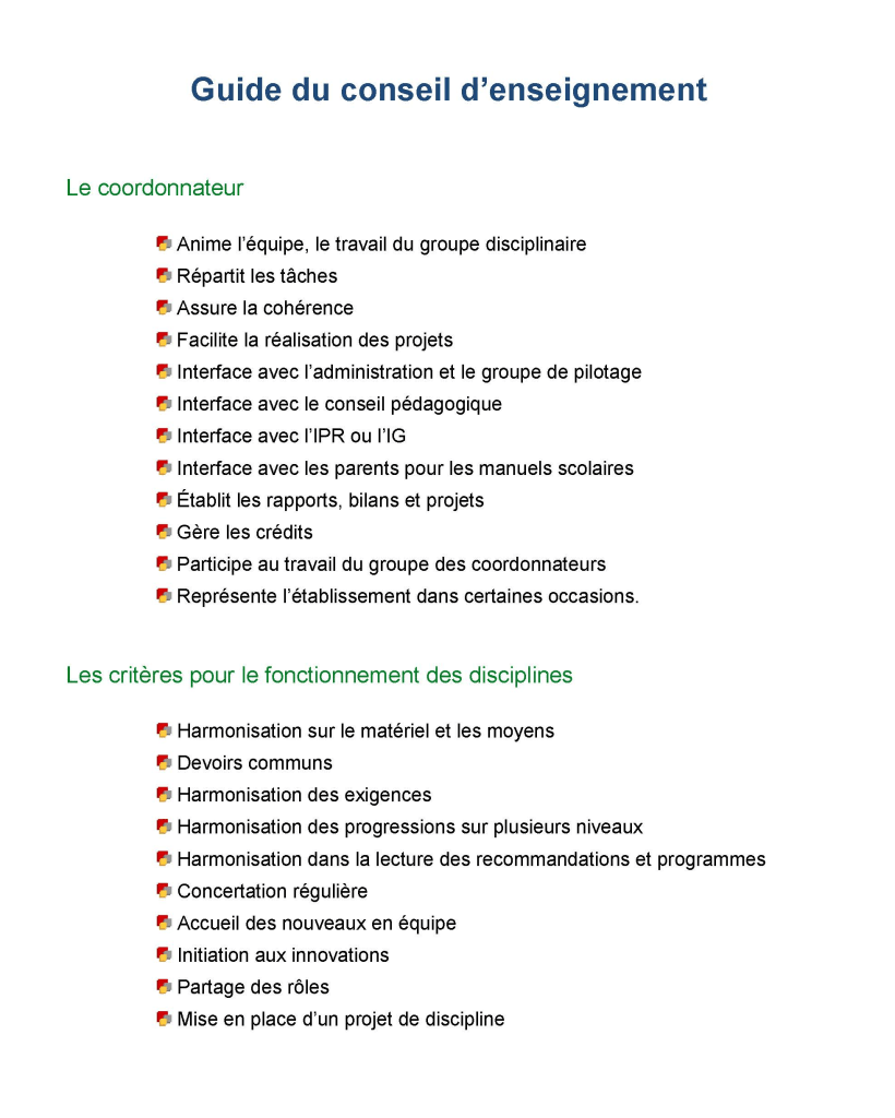 Le coordonnateur du conseil d’enseignement est désigné par ses pairs et validé par le chef d’établissement. Il (elle) assure l’animation, la répartition des tâches, la cohérence et les interfaces avec les autres instances. Les réunions doivent respecter un ordre du jour et un délai de convocation.