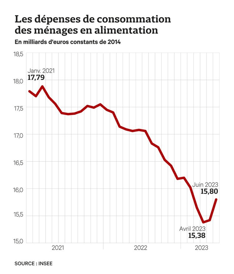 Entre le dernier trimestre 2021 et le deuxième trimestre 2023, les achats alimentaires des Français ont ainsi diminué de 11,4 % en volume selon l’Insee, sachant que cet indicateur mêle deux notions distinctes : les quantités achetées et la gamme de produits retenue. « Cette chute de la consommation alimentaire n’a aucun précédent dans les données compilées par l’Insee depuis 1980 », s’est alarmé dans un tweet François Geerolf, économiste à l’Observatoire français des conjonctures économiques (OFCE).