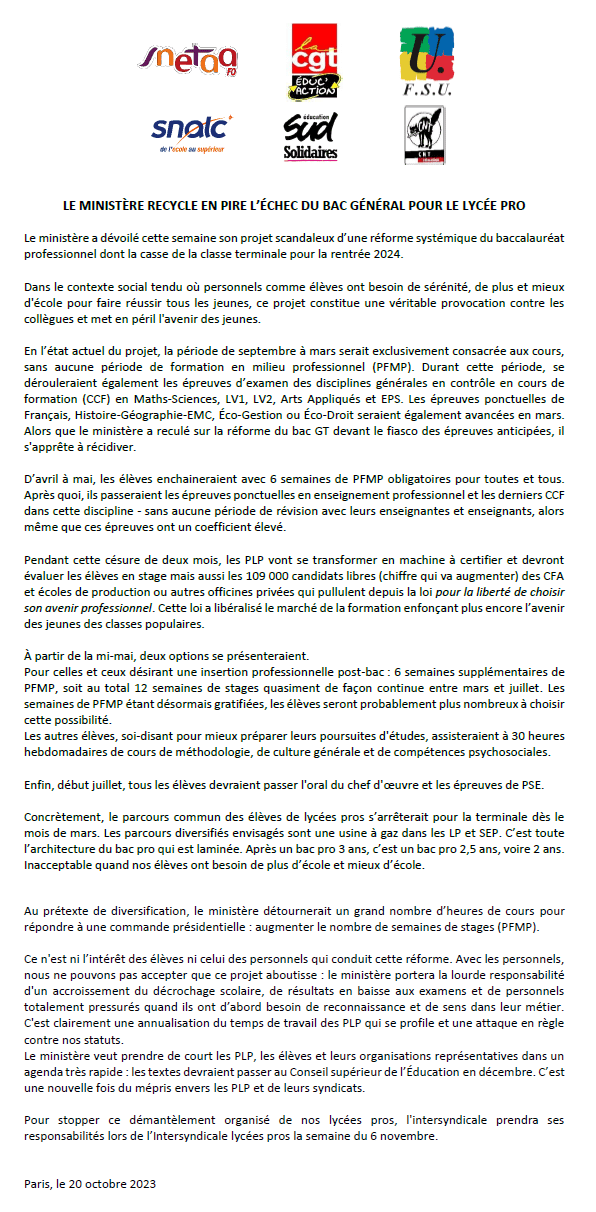 Communiqué de l’intersyndicale voie pro Afficher l’image source