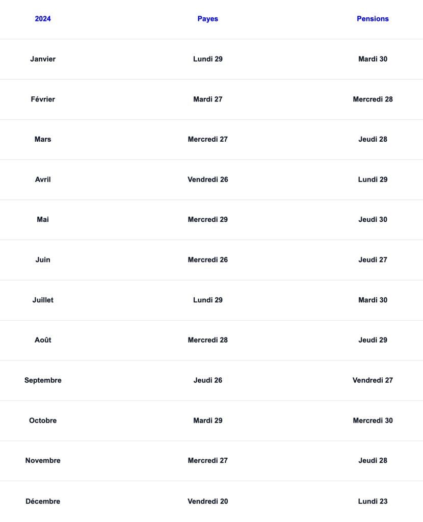 Calendrier des payes et des pensions en 2024