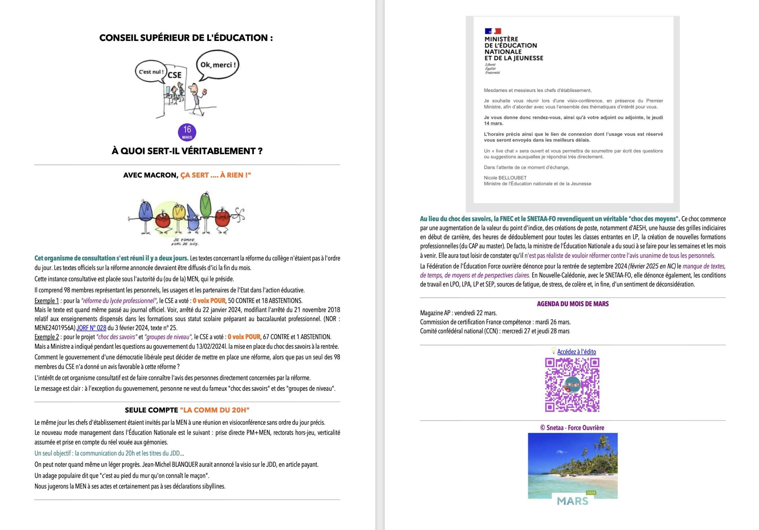 Au lieu du choc des savoirs, la FNEC et le SNETAA-FO revendiquent un véritable « choc des moyens ». Ce choc commence par une augmentation de la valeur du point d’indice, des créations de poste, notamment d’AESH, une hausse des grilles indiciaires en début de carrière, des heures de dédoublement pour toutes les classes entrantes en LP, la création de nouvelles formations professionnelles (du CAP au master). De facto, la ministre de l’Éducation Nationale a du souci à se faire pour les semaines et les mois à venir.