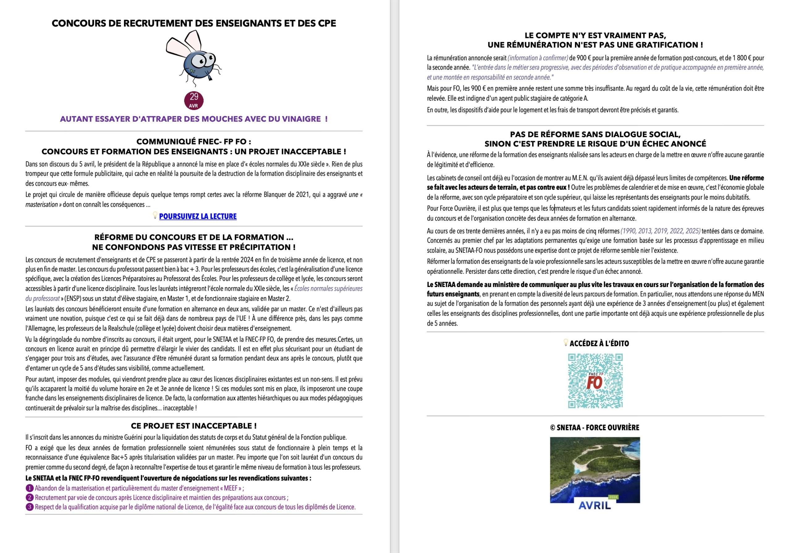 News SNETAA/FNEC FO du mois d’Avril 2024