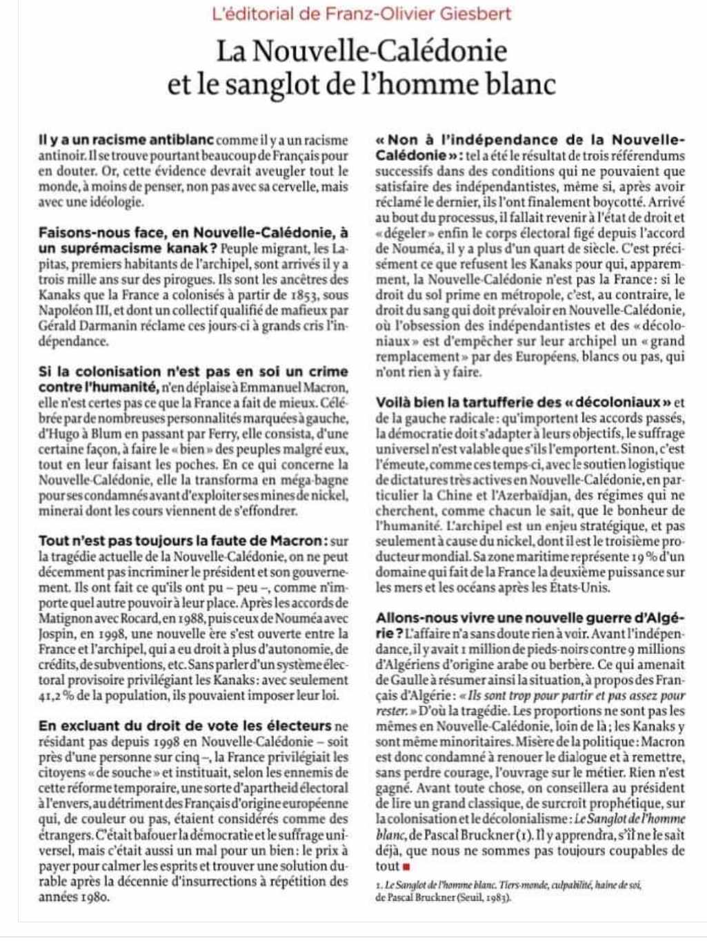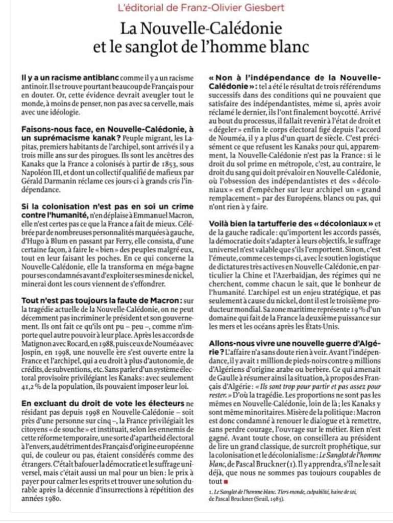 Pour comprendre les passions tristes des émeutiers qui ont incendié plusieurs quartiers de la capitale, il est conseillé de lire l’éditorial publié par FOG qui ose évoquer publiquement le « racisme anti blanc. » Son analyse est très documentée. Pour tempérer son propos, il convient toutefois de signaler que le terme « racisme » n’est pas vraiment approprié pour qualifier ce qui anime les émeutiers. Le choix du terme « xénophobie » eut été plus judicieux, car les émeutiers considèrent les « non kanak » comme des étrangers dans « leur pays. »