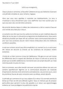 … aux Calédoniens par le biais des élus. Une lettre de deux pages, reçue ce matin du 18 juin et signée de la main du président de la République française : Emmanuel Macron. « Le 13 mai dernier un fil a été rompu ; celui tissé patiemment depuis 1988 par ceux qui avaient compris que les mots valent toujours mieux que les morts… De facto, le président de la République fait un nouvel appel au calme. Il conclut ce courrier en écrivant : « J’ai confiance en notre capacité à trouver ensemble le chemin du respect, de l’ambition partagée, de l’avenir. »