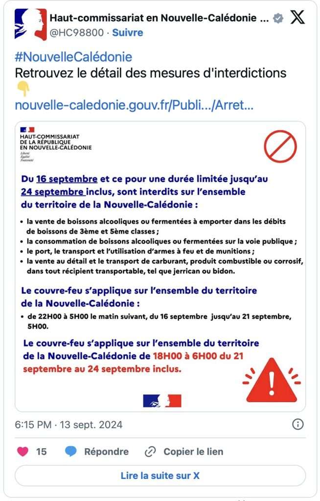 Le couvre-feu en vigueur depuis les émeutes de mai dernier ont été aménagé de 22h à 5h, jusqu’à ce matin, puis il est renforcé partir de demain jusqu’à mardi 24 septembre inclus, de 18h à 6h.
