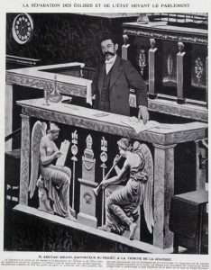 Pour apaiser les tensions et garantir la liberté de conscience tout en continuant l’œuvre de sécularisation de la société française, Aristide Briand propose une loi de séparation des églises et de l’État. Pour résoudre le problème des relations entre l’État français et l’Église romaine, une loi abolit en 1905 le Concordat et le système des cultes reconnus : il n’y a plus de religion recevant une consécration par l’État. L’Alsace et la Moselle n’étant pas françaises au moment de la promulgation de la loi, elles sont toujours sous régime concordataire, c’est-à-dire qu’un accord est passé avec l’église catholique pour déterminer les droits de l’État et des religions reconnues.