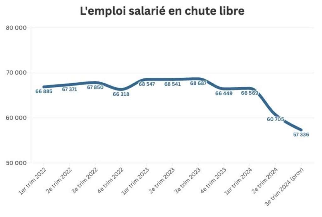 La Nouvelle-Calédonie a perdu l’an dernier 15% des emplois du secteur privé. En un an, 11 351 emplois ont été perdus, selon les chiffres provisoires du troisième trimestre 2024 publiés par l’Institut de la statistique et des études économiques.