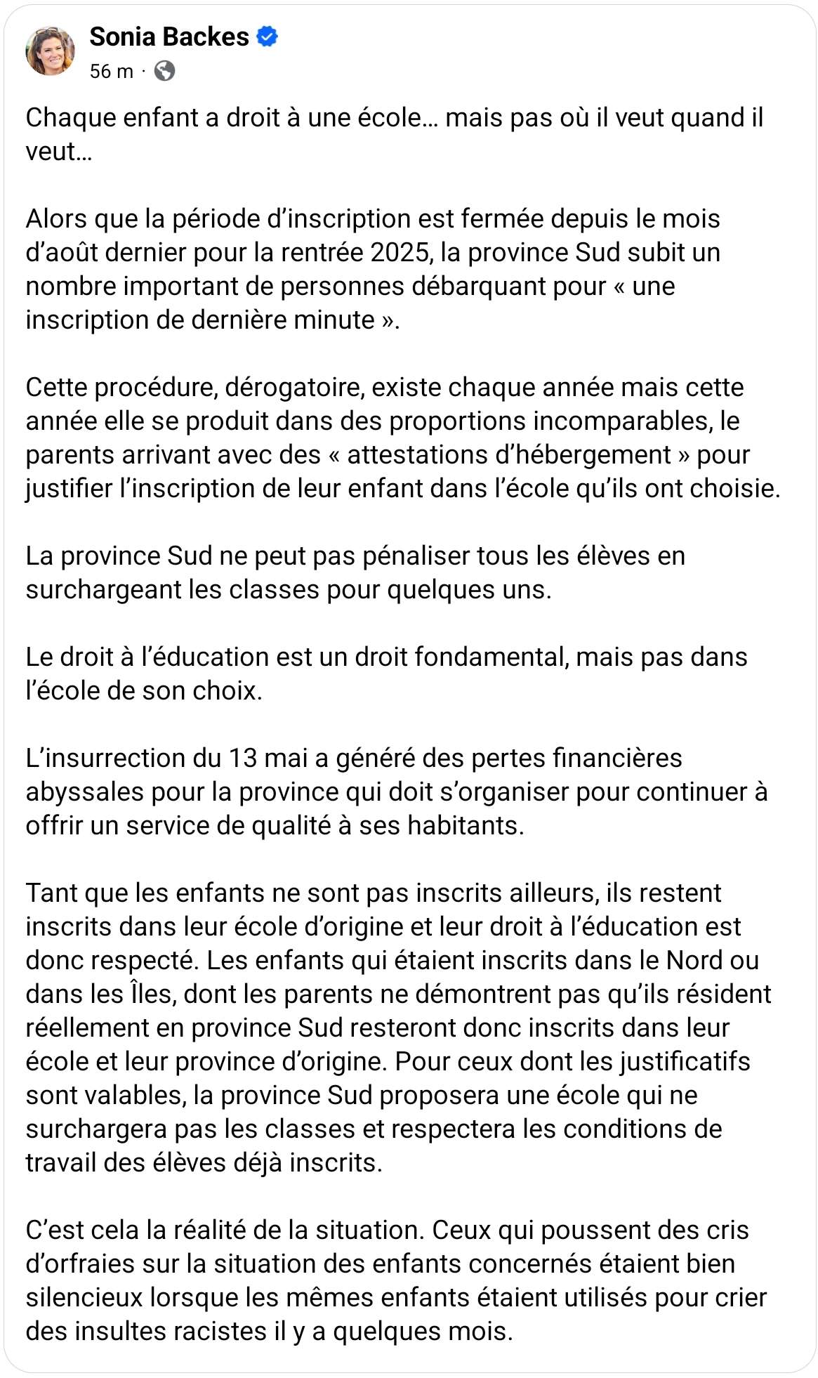 “Chaque enfant a droit à une école… mais pas où il veut quand il veut »… écrit la présidente de la province Sud dans une mise au point publiée sur son site Facebook.