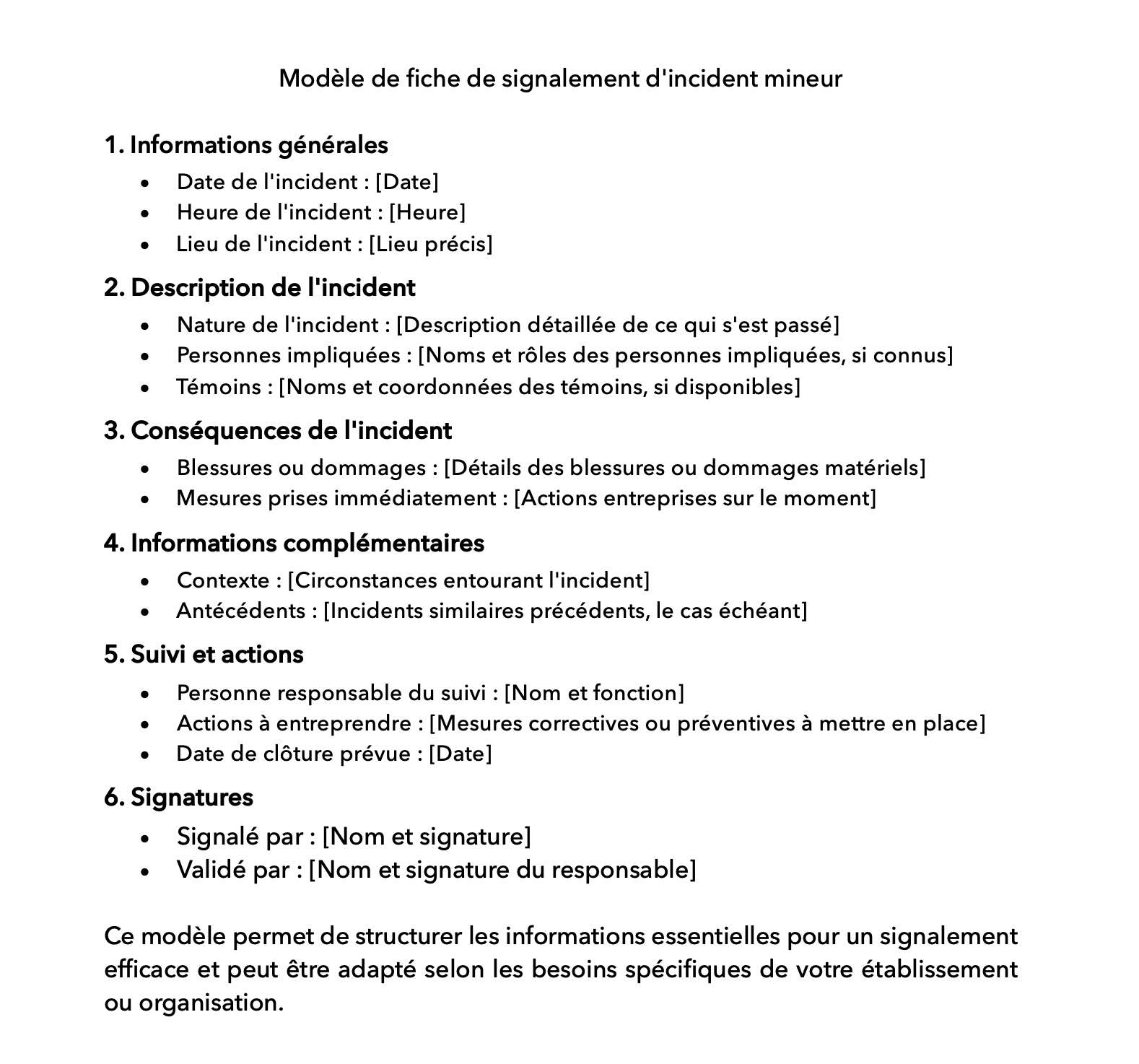 Fiche de signalement d’incident mineur : modèle 1