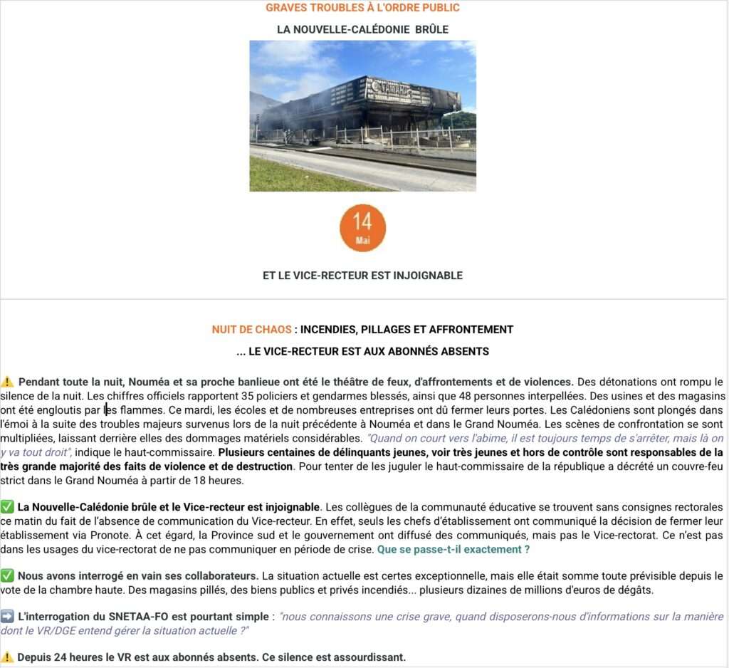 ✅ Alors que l’agglomération du Grand-Nouméa brûlait, le Vice-recteur restait injoignable. Les membres de la communauté éducative se sont retrouvés sans consignes officielles du Vice-rectorat. Isolés, les chefs d’établissement ont communiqué la fermeture de leurs écoles via Pronote. La Province Sud et le gouvernement ont diffusé des communiqués, mais le Vice-rectorat resta particulièrement silencieux à cette occasion.