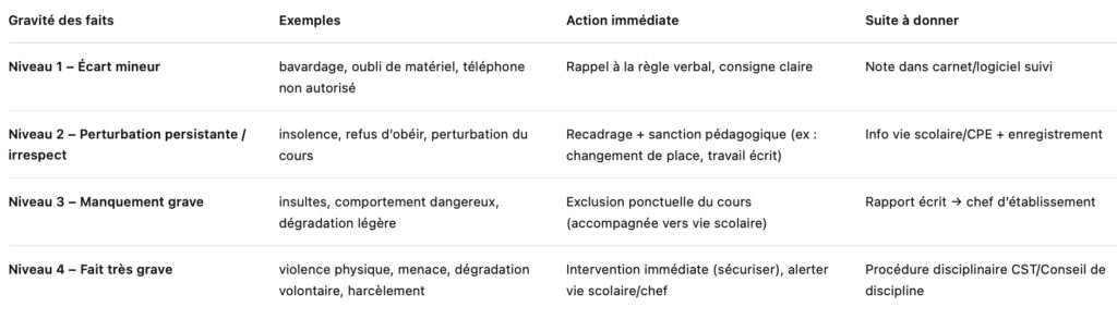 🤝 Pour réagir efficacement face à une attitude inappropriée d’un collégien/lycéen, il faut combiner réactivité immédiate, analyse de la situation et suivi éducatif, tout en restant dans le cadre réglementaire (textes officiels et règlements intérieurs).