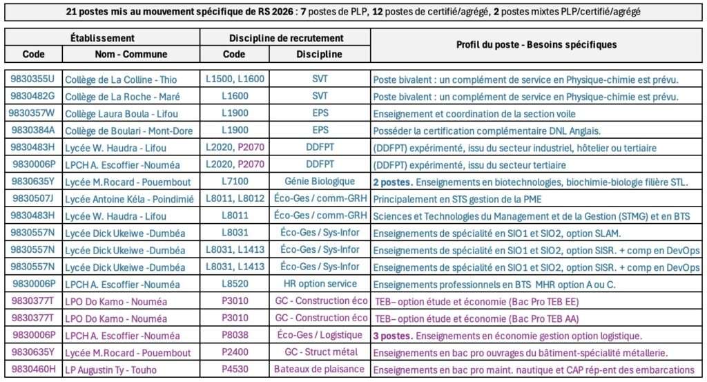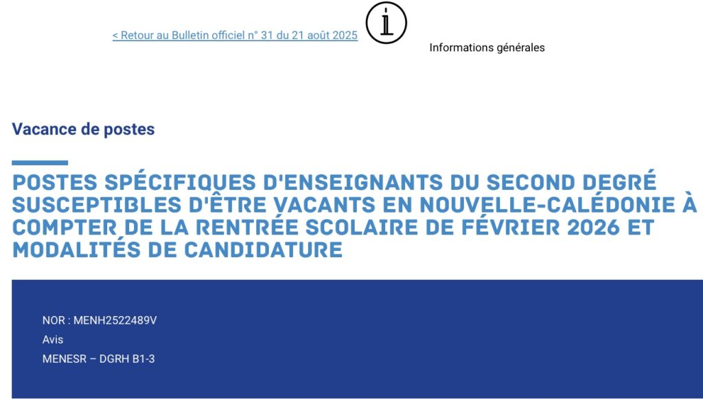 📌 Des postes de professeurs du second degré sont susceptibles d’être vacants à la rentrée scolaire de février 2026 en Nouvelle-Calédonie. (Bulletin officiel n° 31 du 21 août 2025)