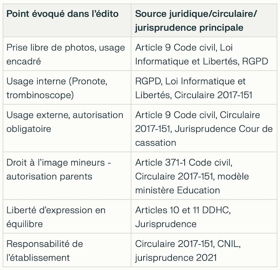 👉 Voici les références des textes qui étayent l’éditorial sur le droit à l’image à l’école, ainsi que des jurisprudences clefs et recommandations importantes. Ces références permettent la protection des droits des élèves et des personnels, tout en autorisant l’utilisation de la photographie dans les établissements scolaires.