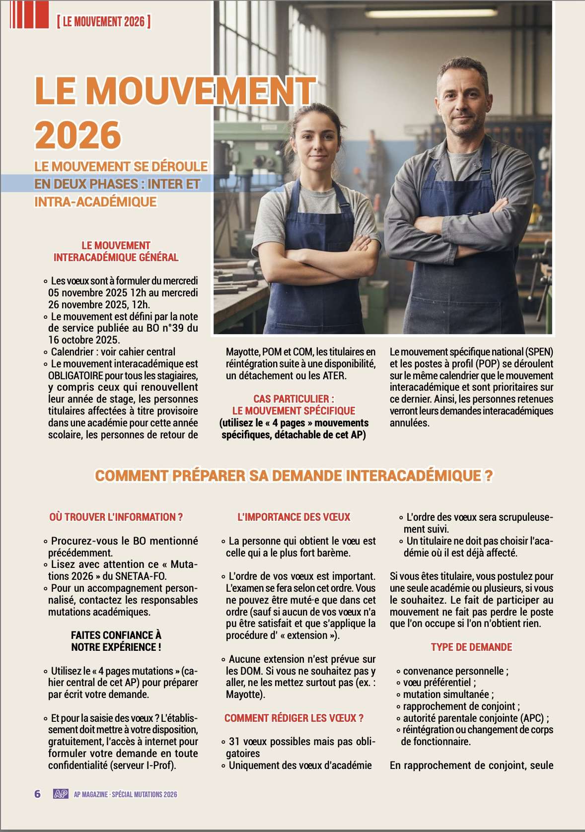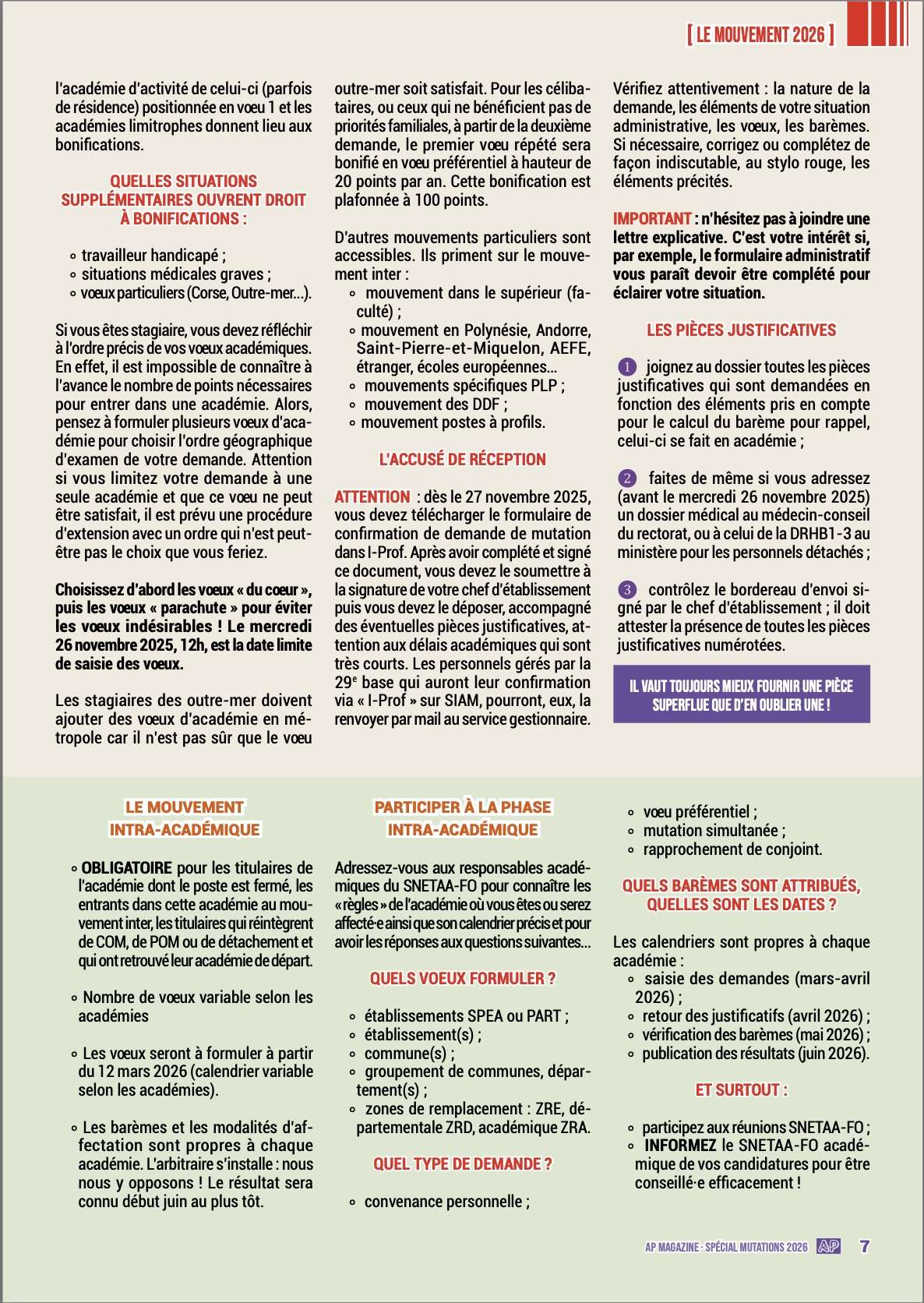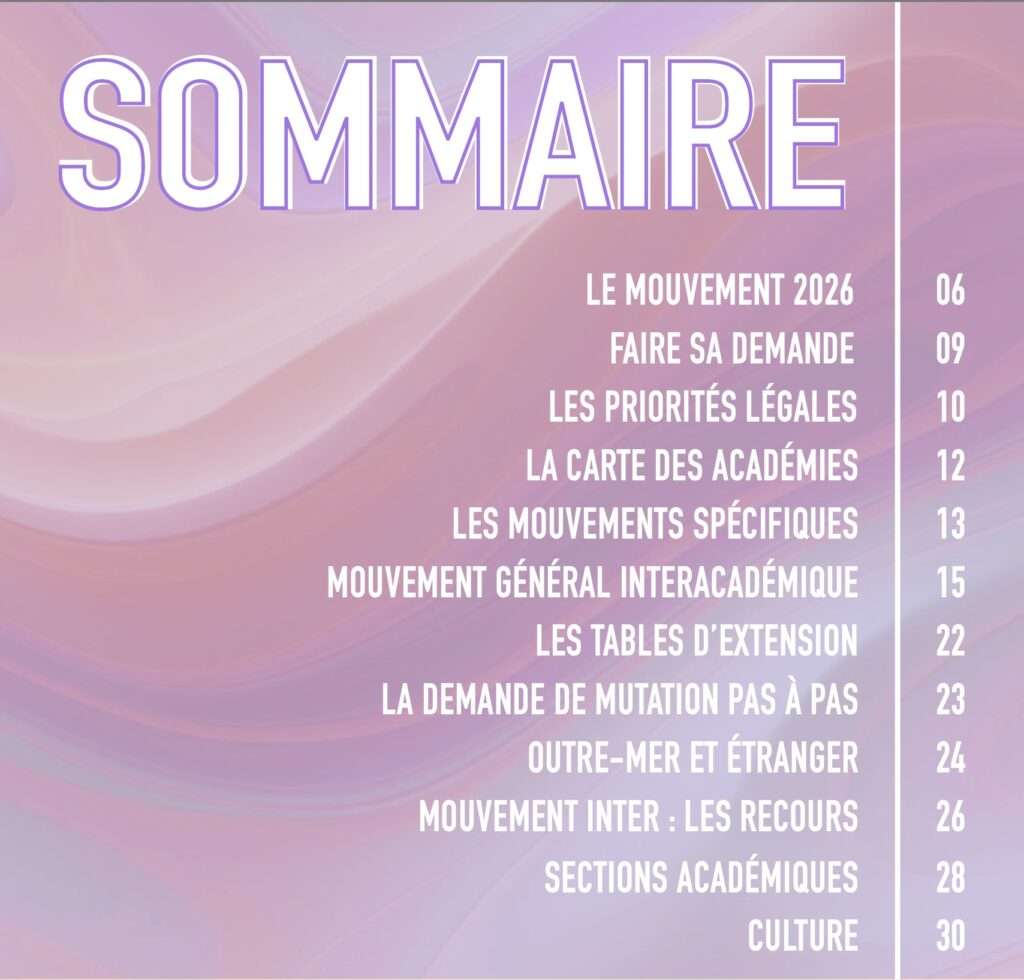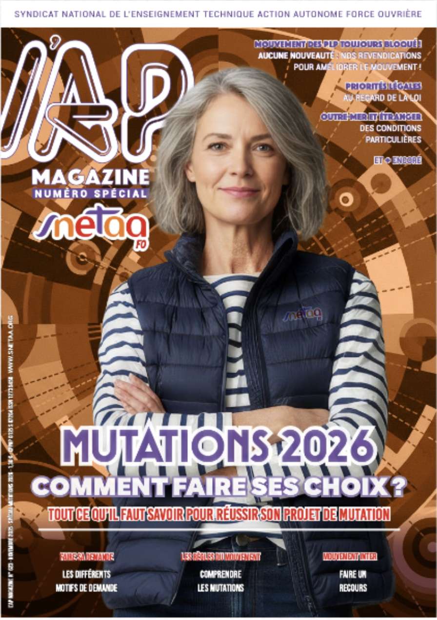 Dans cette optique, ce spécial « mutations 2026 » reste un outil efficace s’il est, en complément, accompagné des conseils de votre référent académique mutation du SNETAA-FO afin de vous assurer au moins 100 % du barème auquel vous pouvez prétendre au regard de votre situation professionnelle et personnelle.