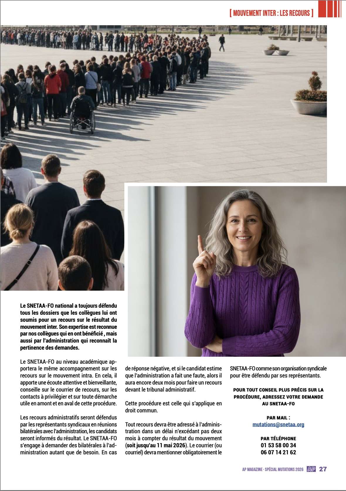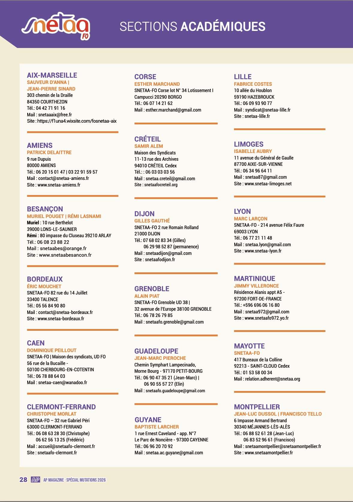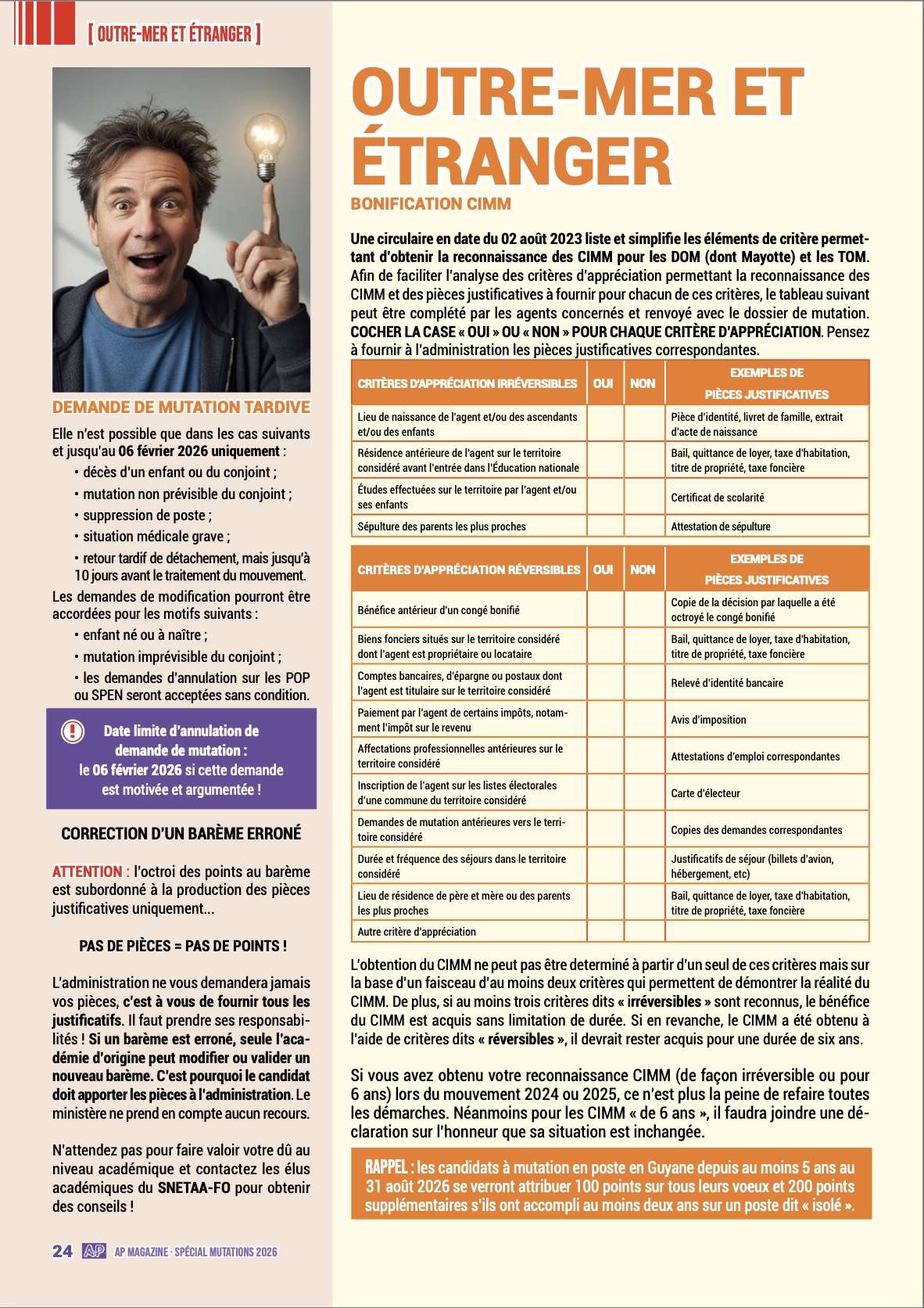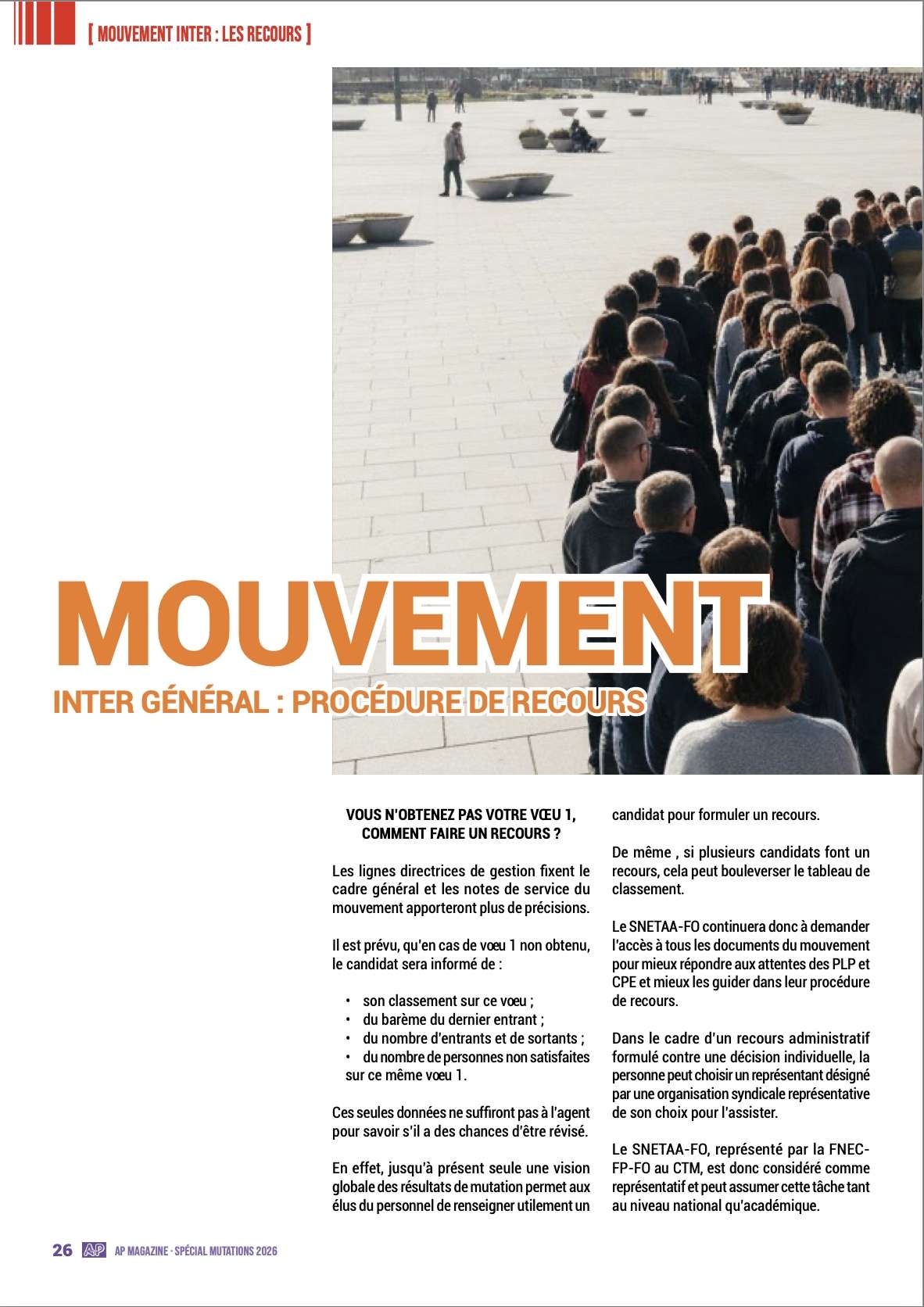 Dans cette optique, ce spécial « mutations 2026 » reste un outil efficace s’il est, en complément, accompagné des conseils de votre référent académique mutation du SNETAA-FO afin de vous assurer au moins 100 % du barème auquel vous pouvez prétendre au regard de votre situation professionnelle et personnelle.