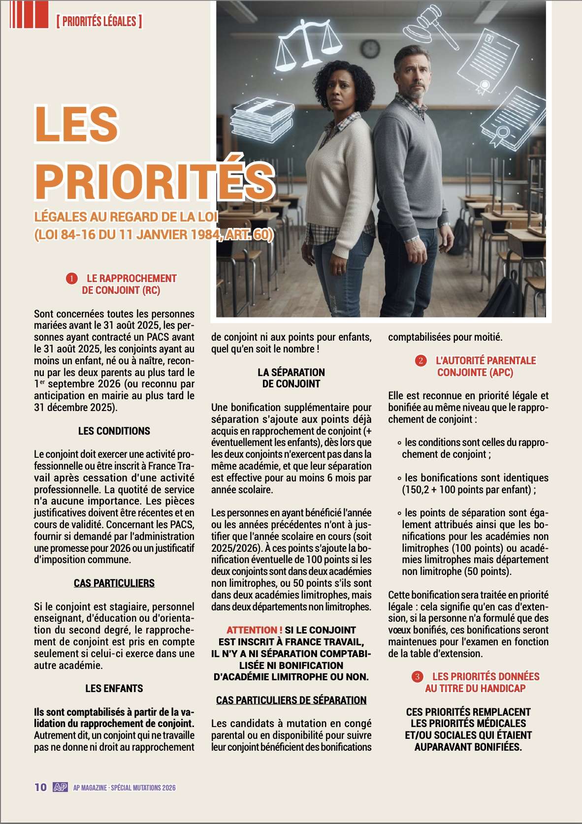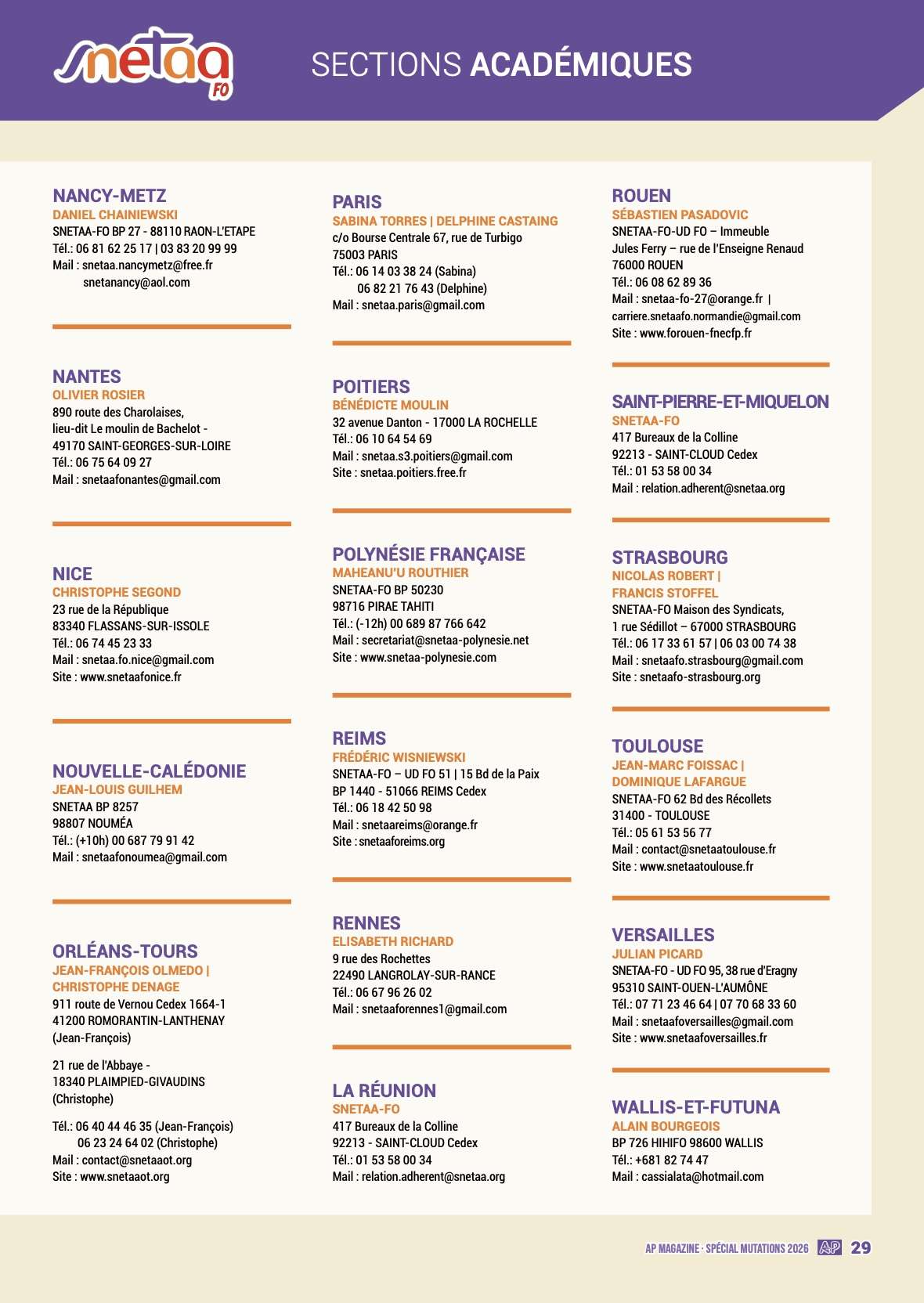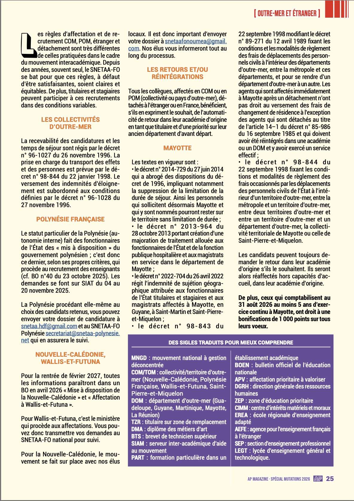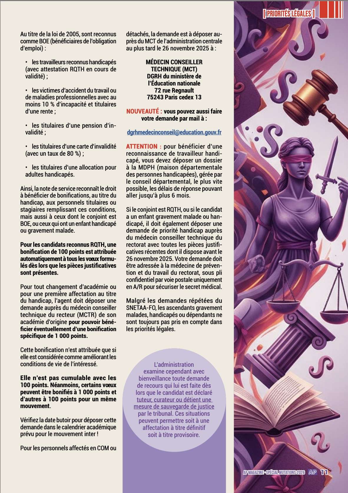 Dans cette optique, ce spécial « mutations 2026 » reste un outil efficace s’il est, en complément, accompagné des conseils de votre référent académique mutation du SNETAA-FO afin de vous assurer au moins 100 % du barème auquel vous pouvez prétendre au regard de votre situation professionnelle et personnelle.