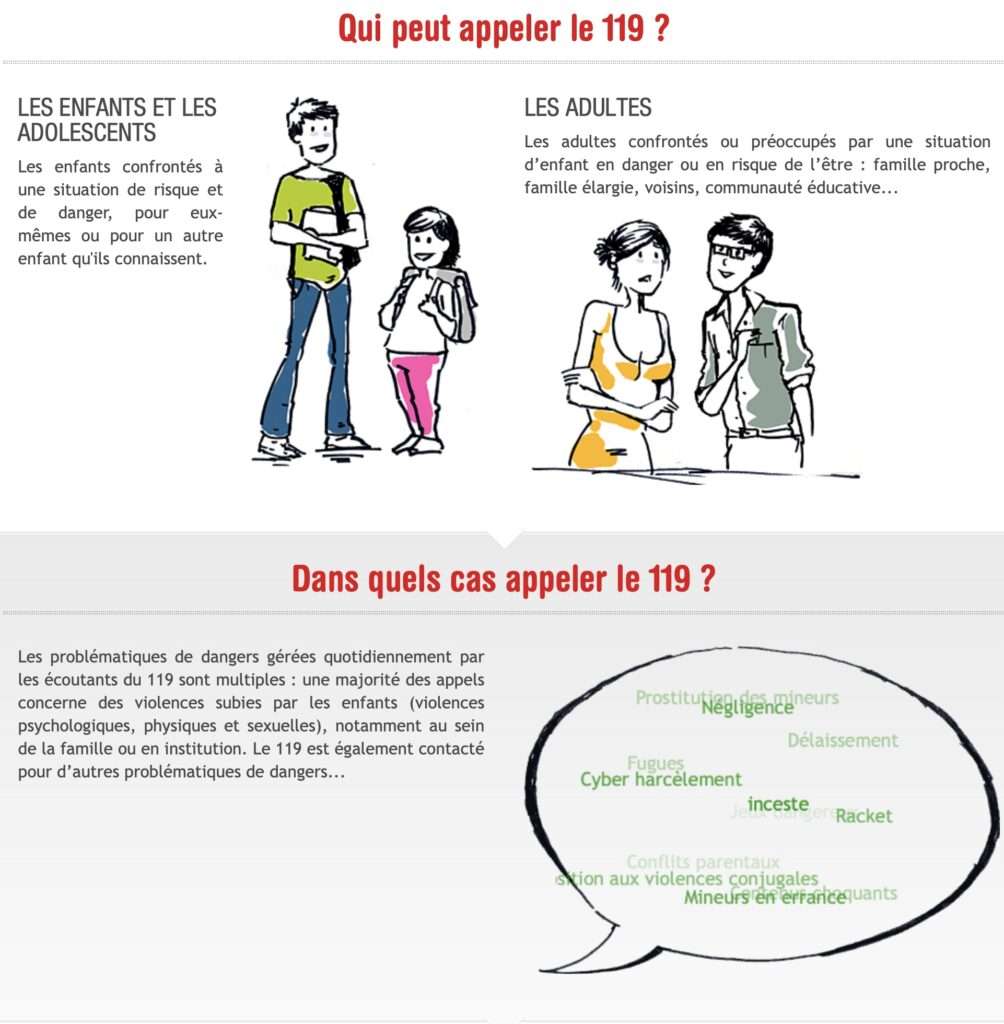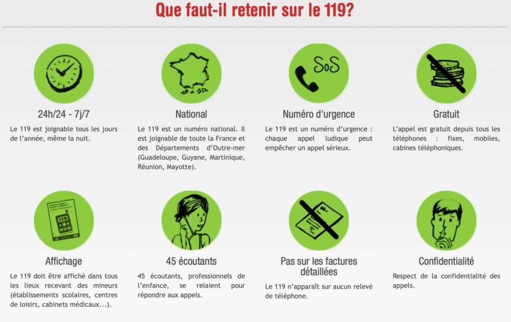 Le 119, en France, est un service national d’accueil téléphonique pour l’enfance en danger (SNATED) accessible 24h/24, 7j/7, gratuitement, sans que l’appel n’apparaisse sur la facture.